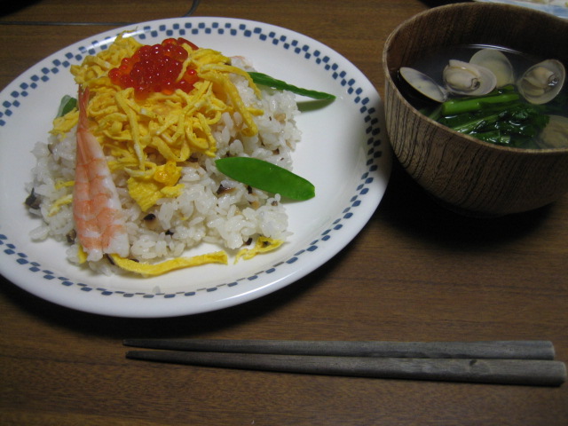 晩御飯は、定番のちらし寿司とはまぐりのお吸い物です。