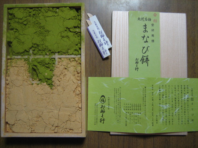 きなこと抹茶をたっぷりまぶした求肥餅です。