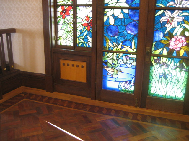 内装のステンドグラスや、組み木細工の床も素敵。