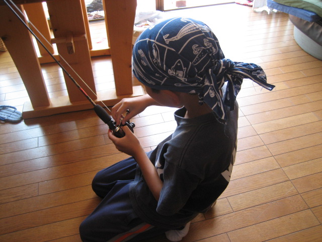 今日は釣竿を出して釣りに行く準備をしながら、ヘアスタイルもばっちりきめてます。