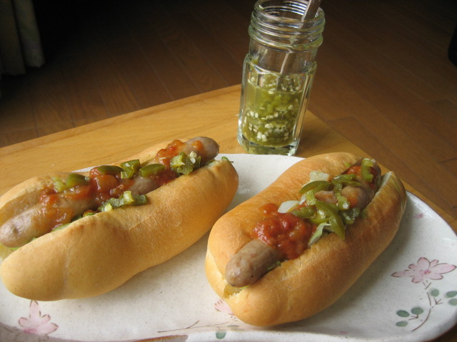 無添加ソーセージをはさみ、トマトソースとハラペーニョのピクルスをのせれば