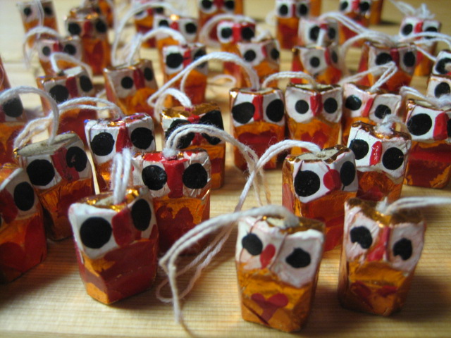 ミャンマーではふくろうは幸福のおまもりで、お部屋のあちこちに吊るすんだそうです。