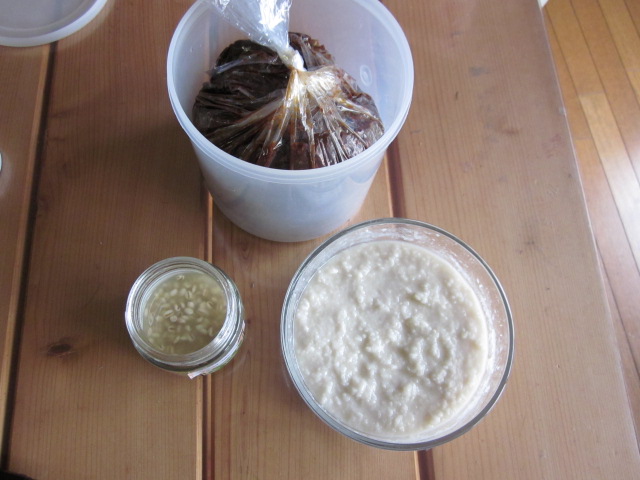 右は、母が熟成中の乾燥米こうじで作った塩こうじ。