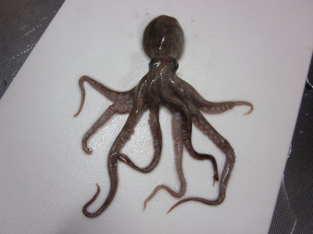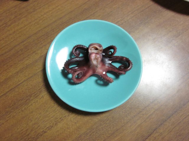 茹でダコにして、豪快にタコの足をはさみでチョキンと切りながら