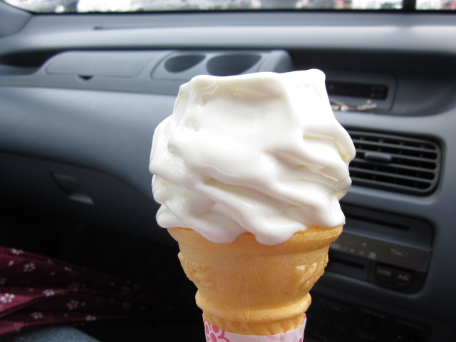 なんとかソフトクリームを買ったものの、座る場所もないので車に戻りました。
