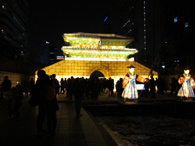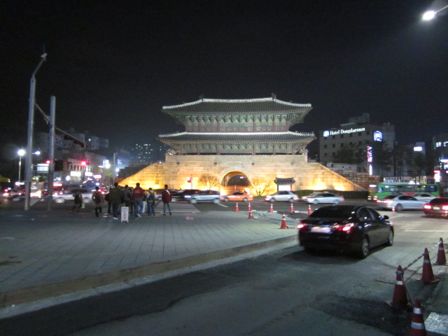 ライトアップされた東大門を眺めながら。