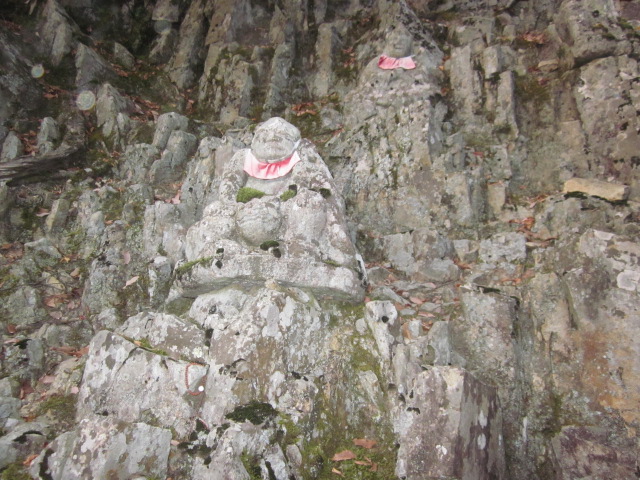 参道の石段横の岩山に安置されている十六羅漢像。