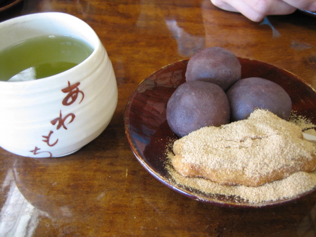 きなこと抹茶をたっぷりまぶした求肥餅です。